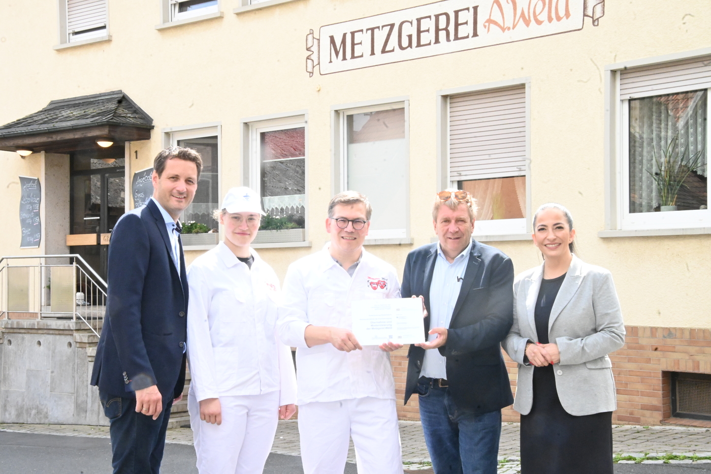Eine Förderung durch das Amt für ländliche Entwicklung (ALE) überreichte Jürgen Eisentraut (4. von links) an Metzger Julian Hertzig und Tochter Ellena im Beisein von MdL Björn Jungbauer (links) und MdB Dr. Hülya Düber (rechts).